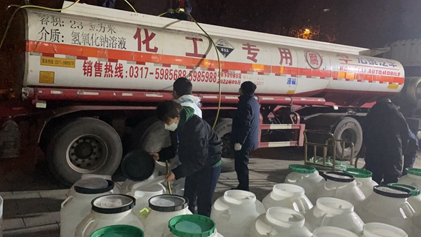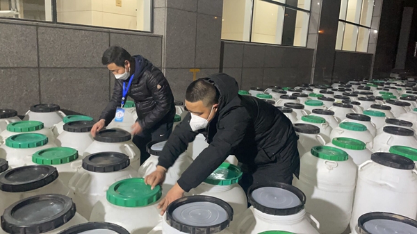 12月31日凌晨0點(diǎn)05分陜煤集團(tuán)工作人員伴著夜幕卸載消毒液。