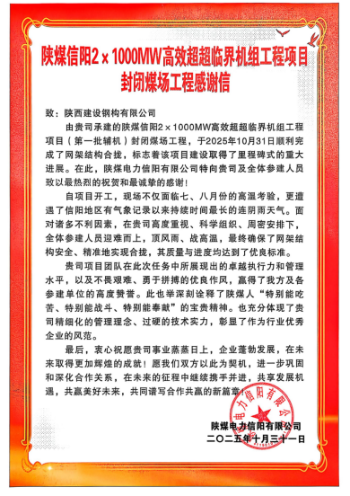 近日,陜西建設(shè)鋼構(gòu)有限公司收到陜煤電力信陽有限公司發(fā)來的感謝信,信中對建設(shè)鋼構(gòu)在承建陜煤信電2×1000MW高效超超臨界機組項目封閉煤場工程中表現(xiàn)的卓越的執(zhí)行力和管理水平以及不畏艱難、勇于拼搏的優(yōu)良作風(fēng)表示誠摯的感謝!感謝信指出,陜煤信陽2×1000MW高效超超臨界機組工程項目封閉煤場工程于2025年10月31日順利完成了網(wǎng)架結(jié)構(gòu)合攏,標志著該項目建設(shè)取得了里程碑式的重大進展。陜煤信電特向建設(shè)鋼構(gòu)全體參建人員致以最熱烈的祝賀和最誠摯的感謝!感謝信中說,自項目開工以來,現(xiàn)場不僅面臨七、八月份的高溫考驗,更遭遇了信陽地區(qū)有...
